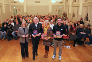 Bürgermeisterin Julia Zupancic überreichte den Preis an Frank Heinrich (1. Platz) für die Extraschicht, Christian Schürmann (2. Platz) für das FREEFALL-Festival und an Barbara Folkerts (3. Platz) für das Sonntags-Café.